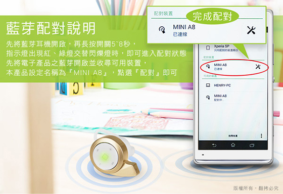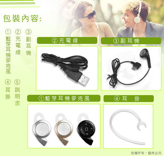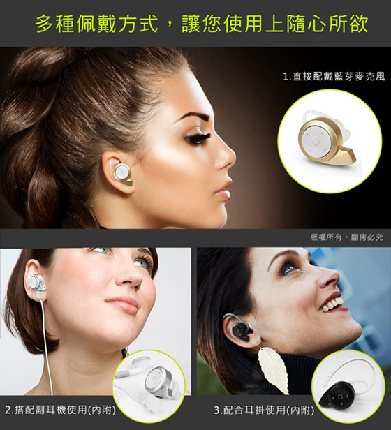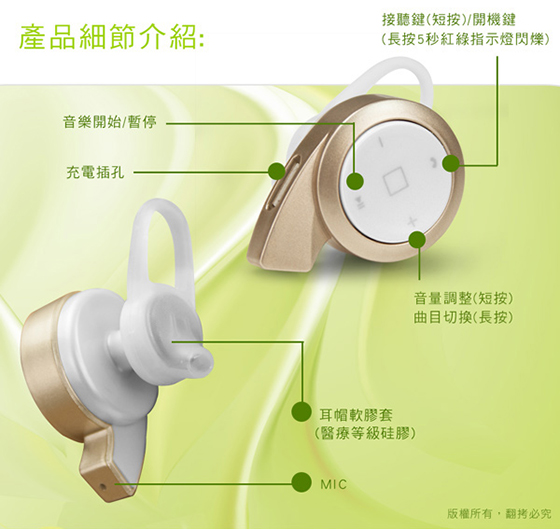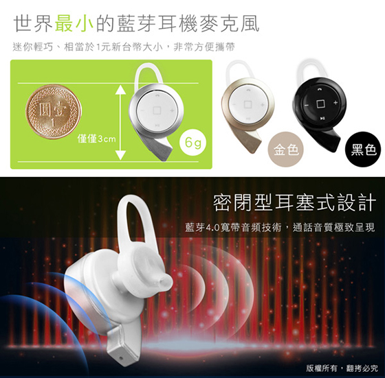 商品特色無線藍耳機麥克風,操作範圍10公尺,擺脫耳機線的糾纏,全球最迷你,輕巧好攜帶✔ V4.0藍牙版本,傳輸速率更快更穩健、低干擾性✔ 採用國際頂級芯片,強力降噪,音質更清晰✔ 耳機擁有語音提示功能,來電時更會貼心報號✔ 單鍵按鈕設計,操作簡單,不影響耳機外觀✔ 支援IOS系統藍芽耳機電量顯示,剩餘多少電量,都能透過手機了解✔ 多設備連結技術允許您將耳機連結到兩台設備,使用者只需重複配對步驟,即可同時連結二台裝置✔ 貼心初始音量設置,避免聲音過大而造成傷害,呵護您的雙耳,可透過手機調整音量✔ 多款顏色提供選擇,搭配個人穿搭更顯時尚
